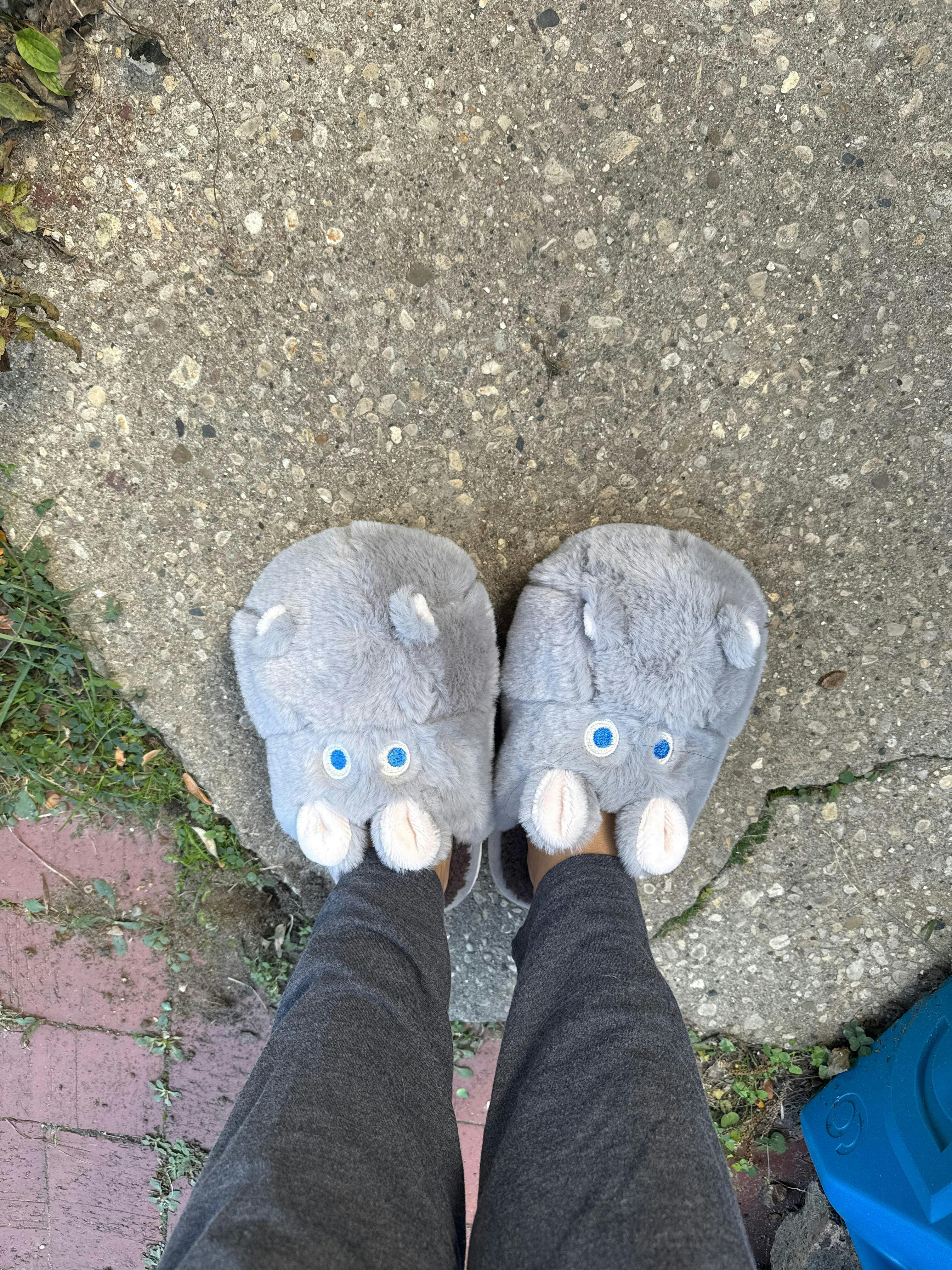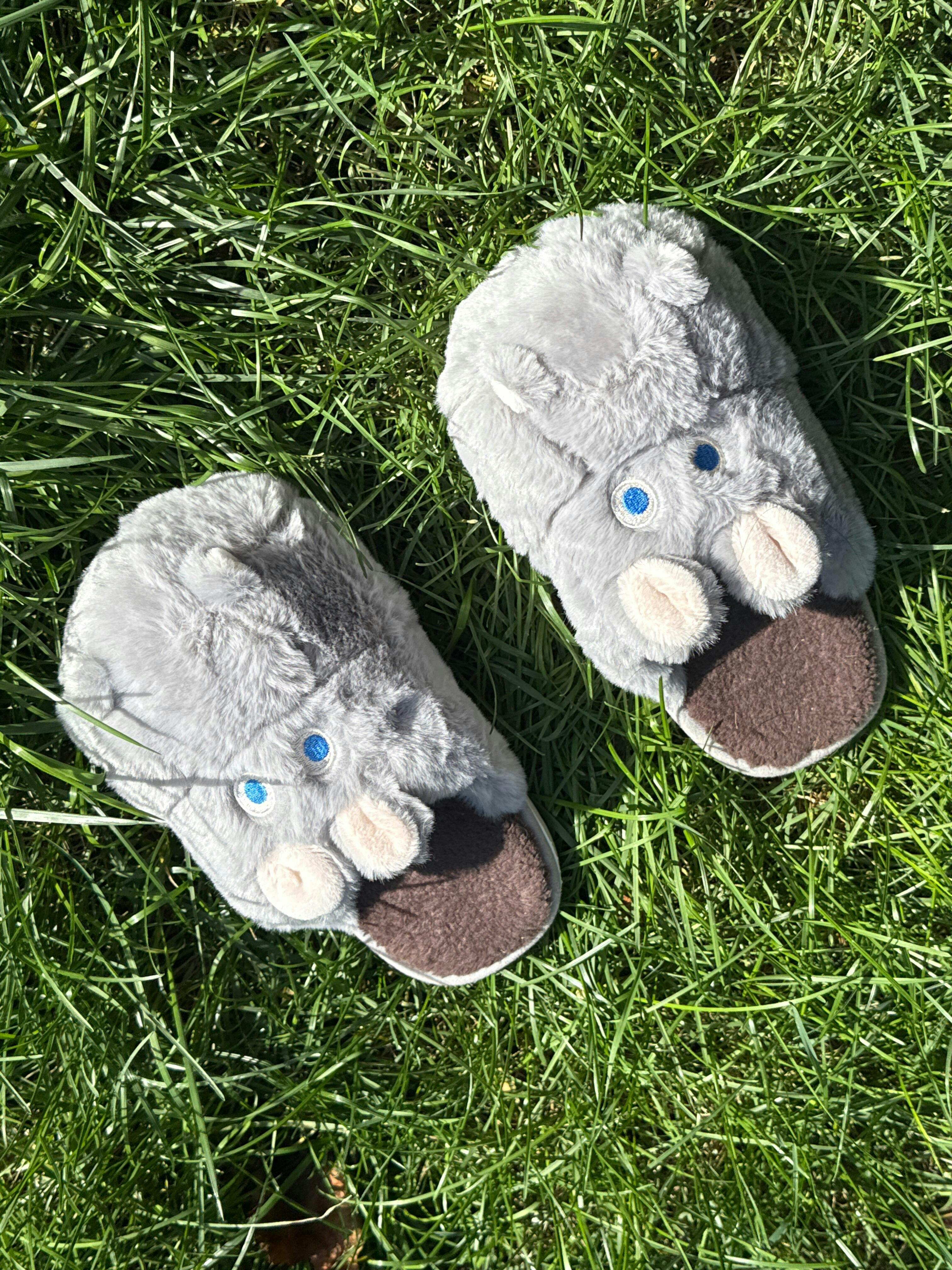 Bring a splash of fun to your feet with these Fuzzy Hippo Slippers! Featuring cute ears with pink accents, bright embroidered blue eyes, and flared nostrils, they’re crafted from ultra-soft gray plush.